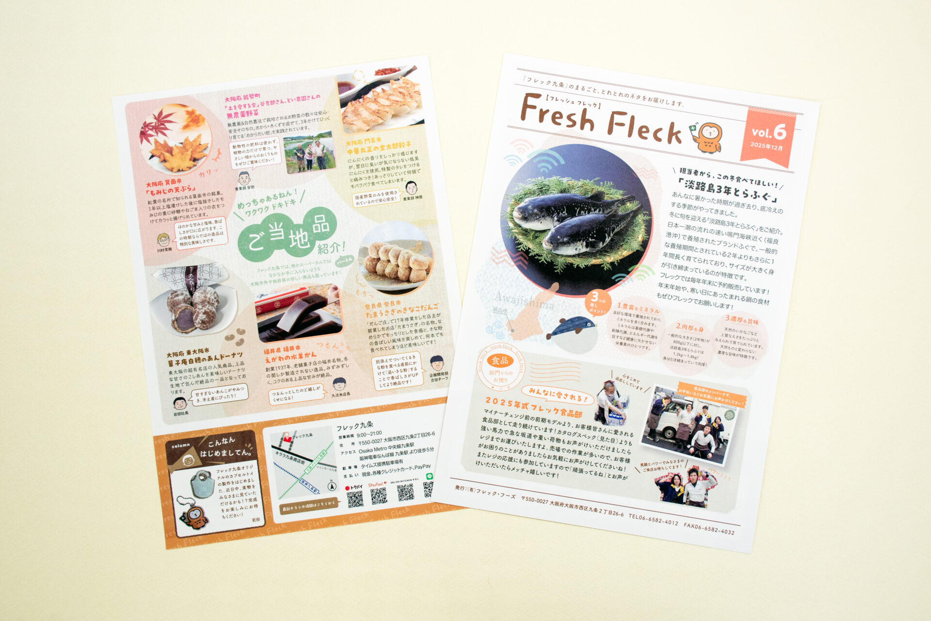 大阪市西区にあるスーパー「フレック九条」の広報紙「Fresh Fleck(フレッシュ フレック)」の制作を行っています。1店舗のみのスーパーだからこそ、こだわって仕入れる商品や特徴ある催事などの魅力が数多くあり、それを伝える広報ツールとなっています。