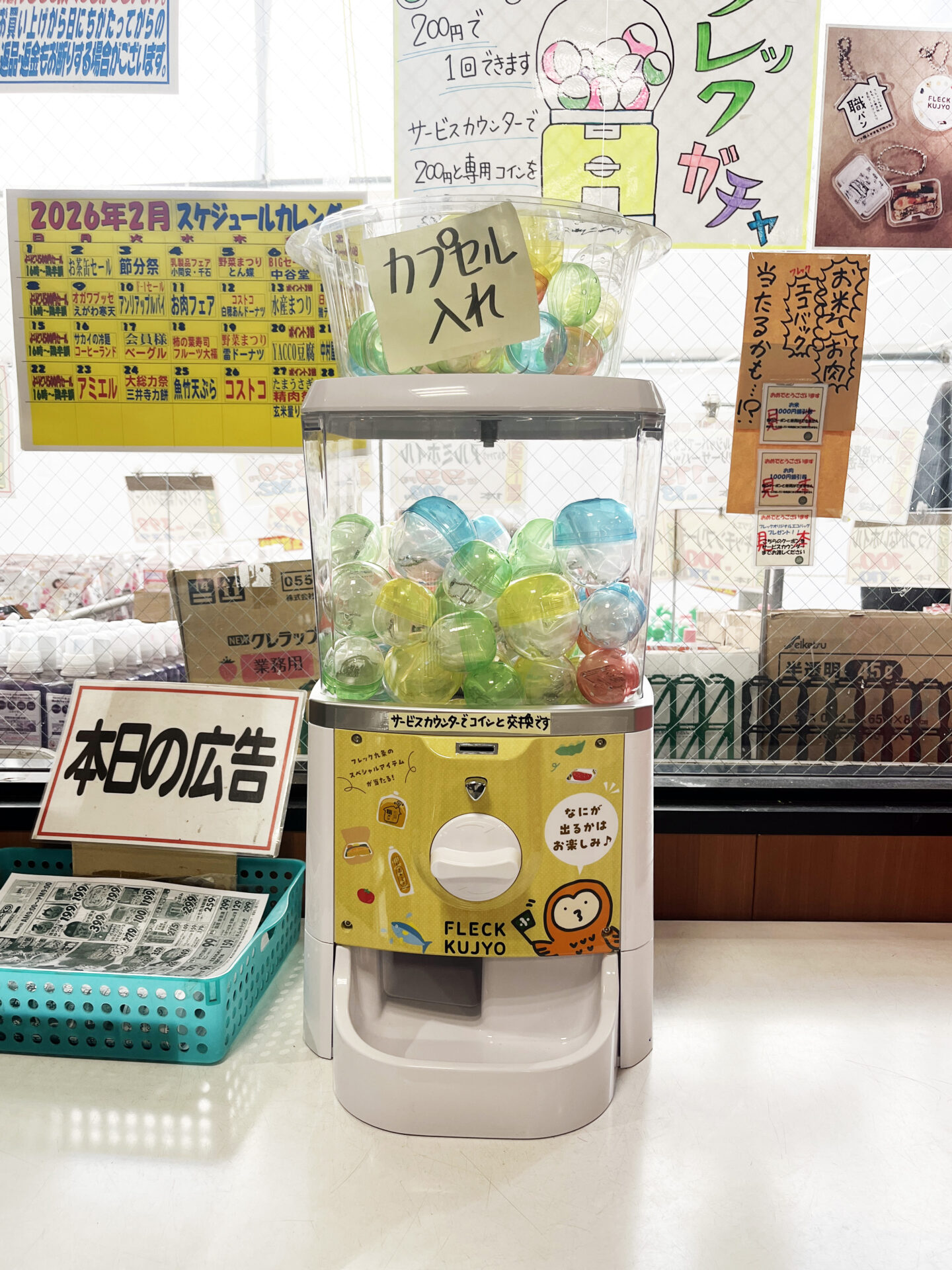 カプセルトイはサービスカウンターにて200円と専用コインを交換後、サッカー台設置のマシーンにコインを入れて、くるっと回すだけ!ご来店の際はぜひ回してみてください。