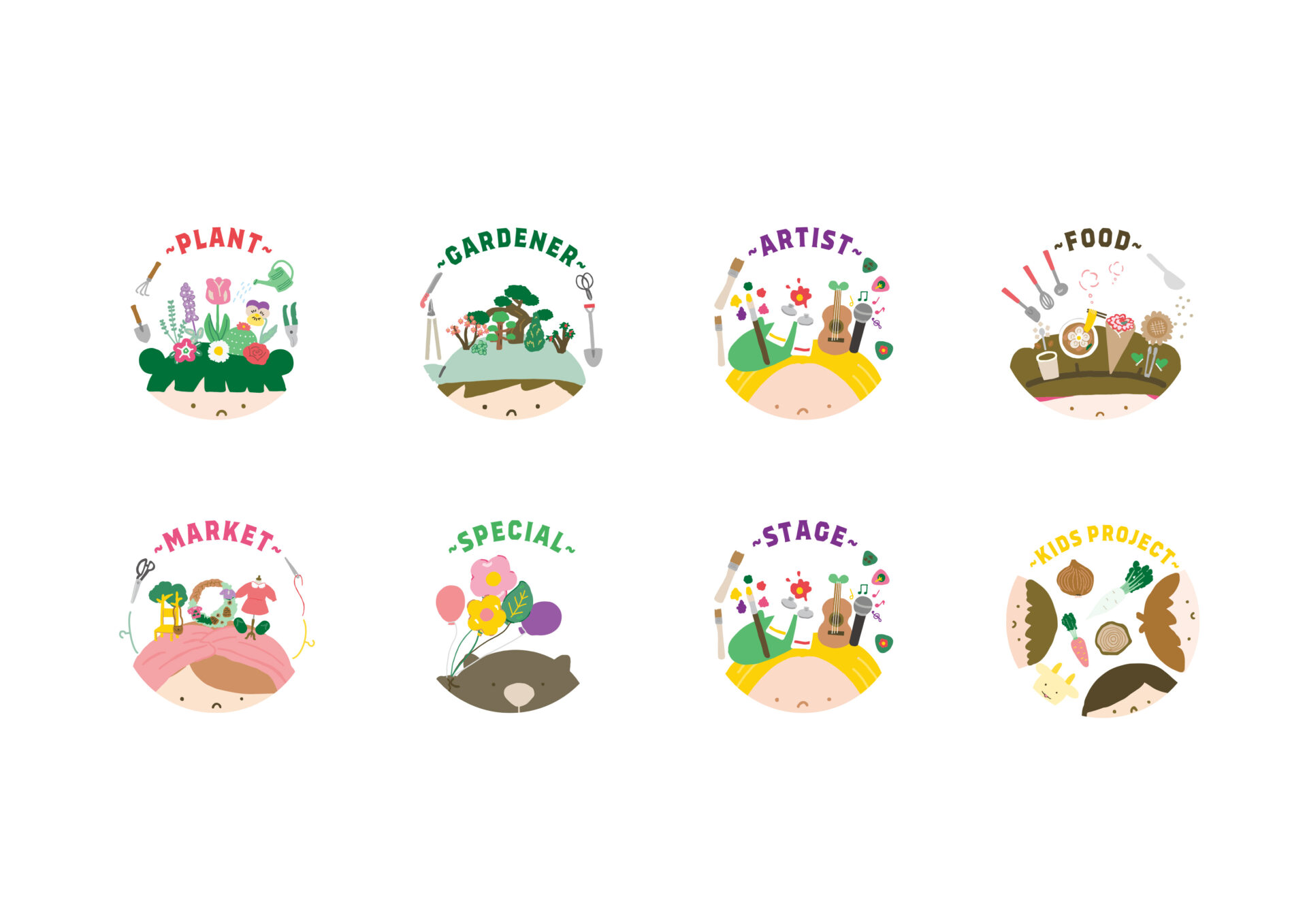 2023年より「BOTAFES」の広報物デザインを担当しています。メインビジュアルでは、植物、植木、フード、アートが頭から生えている人々を描きました。それぞれが頭で思い描いているものがかたちになっていくことで、幅広い方々に来ていただけるイベントになるよう想いを込め、平易なデザインを心がけました。そこからチラシ、ポスター、当日のパンフレット、SNS用画像などに展開しました。