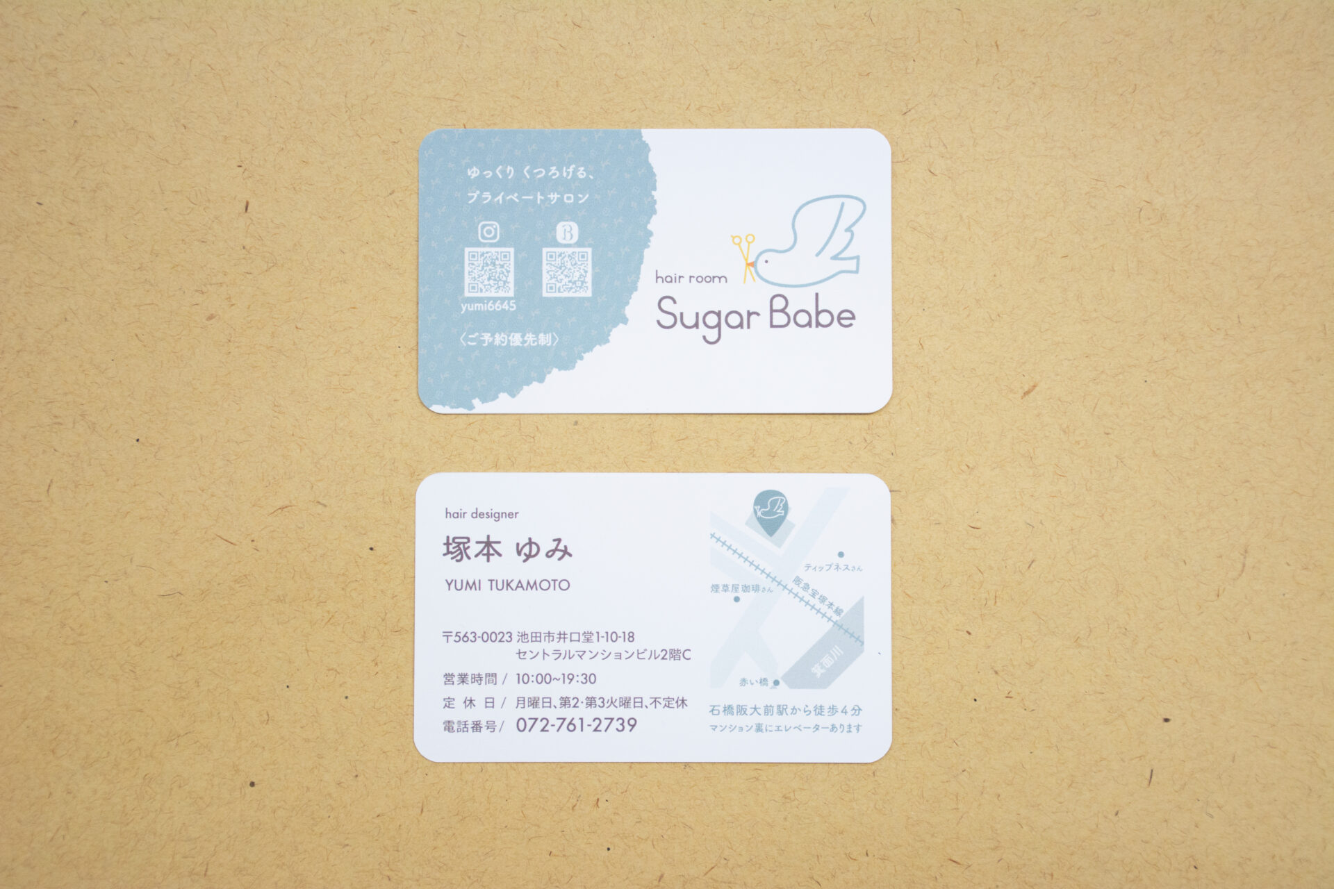 大阪府池田市にあるマンツーマンの美容室「hair room Sugar Babe」の店主・塚本さまから、お店が10周年を迎えるタイミングでロゴリニューアルのご依頼をいただき、デザインさせていただきました。