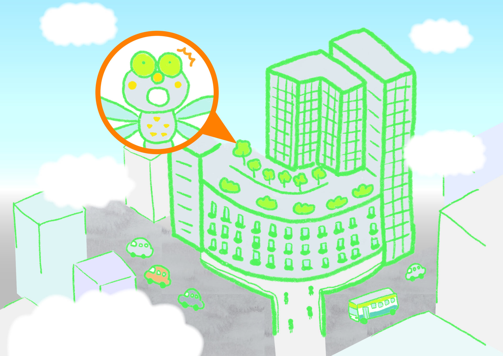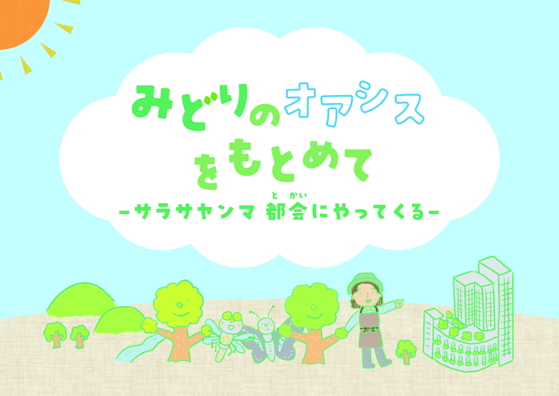 生き物を主役に、生き物目線のストーリーにすることで都市と自然の融合をキャッチーに伝えられると考え、大阪梅田ツインタワーズ・サウスで実際に発見されたサラサヤンマの「サラ」が主人公のストーリーを企画しました。