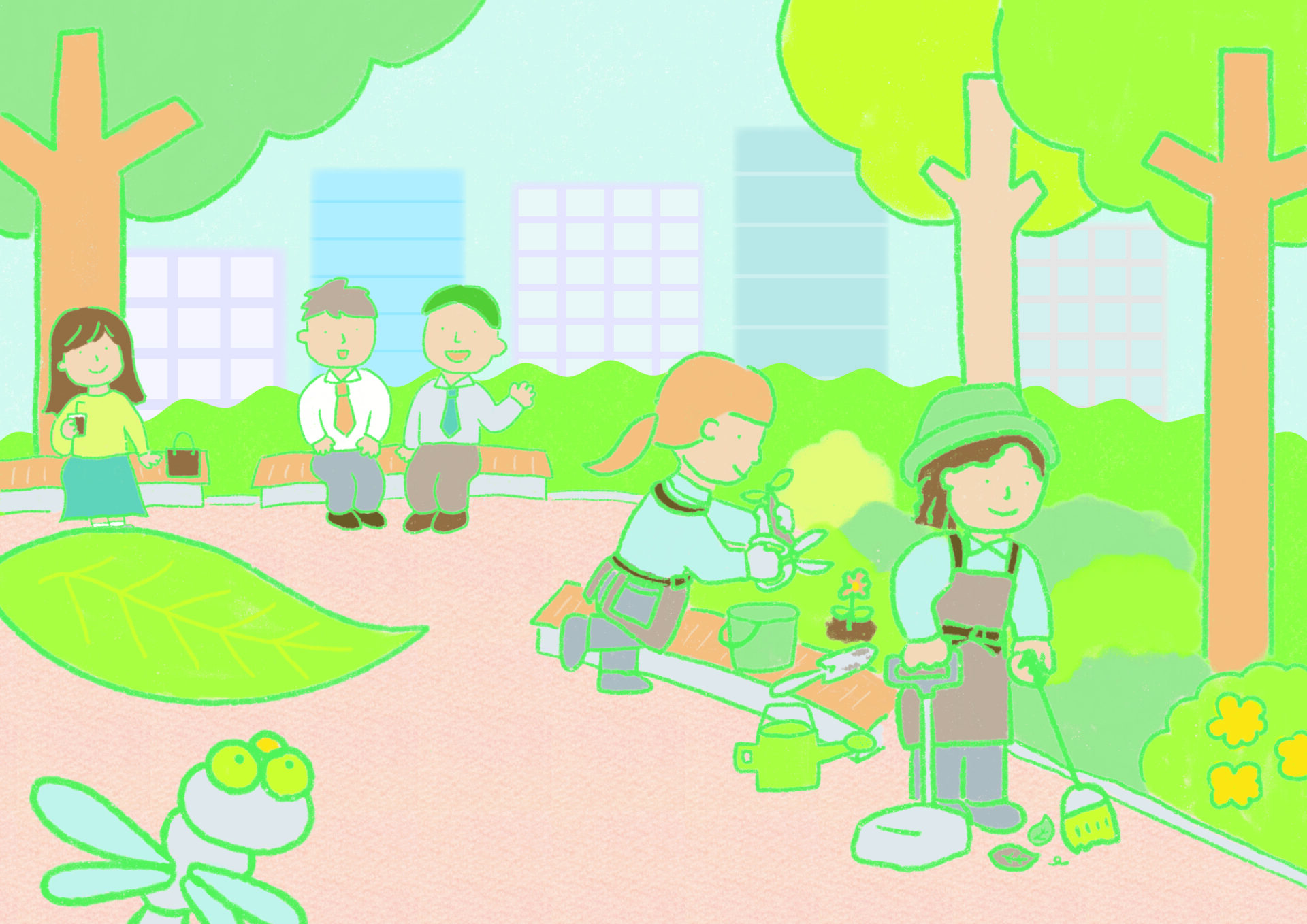 そこにはみどりの木の下で、おはなしをしている人や、コーヒーを飲んでいる人もいます。いろんなみどりのお世話をしている人たちがいます。サラはアオスジアゲハの「アオ」に出会い、この森のことについて教えてもらいます。